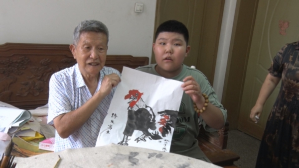 8月2日下午,书画频道天津工作中心主任周连起携其子周博文做客张洪千宝坻画室,张洪千亲笔修改,为其讲解书画创作为作品题字。