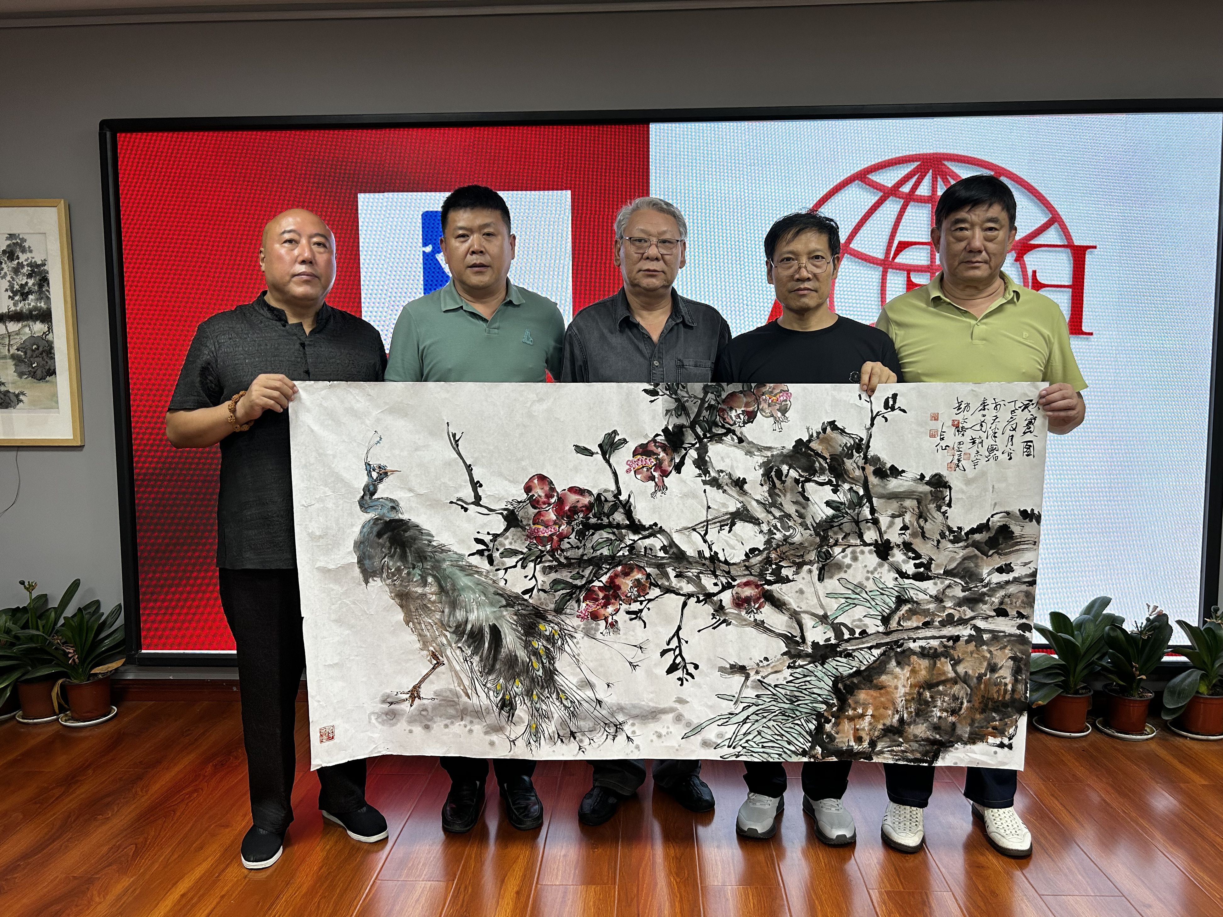 8月11日,秦少甫受书画频道天津工作中心主任周连起之邀,带领教学团队做客书画频道天津工作中心,与助教梁汉民、赵旭昊、赵文胜联合创作大幅国画作品,以累累硕果歌颂时代新风貌。