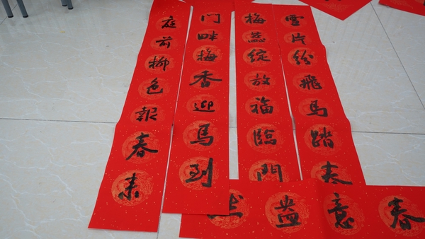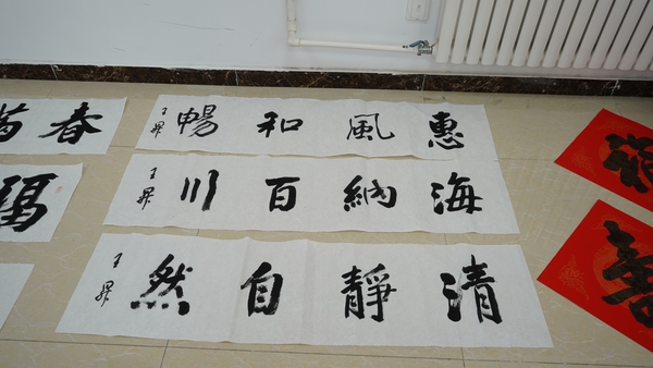 书画院院长王升邀请天津市书画名家冉繁英、季家松、郝金宝、卢智剑、关树锋,书画频道天津工作中心主任、南开区美术家协会副主席周连起、小书画家周博文等走进社区居委会,挥毫泼墨,为社区基层工作人员与社区居民书写春联“福”字,送去新春的祝福。 活动现场,长案上提前铺好大红宣纸,为春节的喜庆氛围早早打好了底色,书画家们热情高涨,笔锋或刚劲挺拔、或飘逸灵动,一个个“福”字饱满圆润,“东风入户千家乐,喜气盈门万象新”等春联对仗工整,将新春的美好期许凝于笔墨之间,送入居民与工作人员手中。